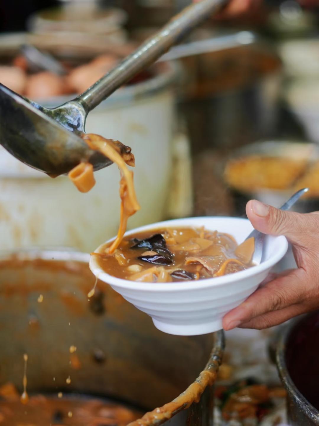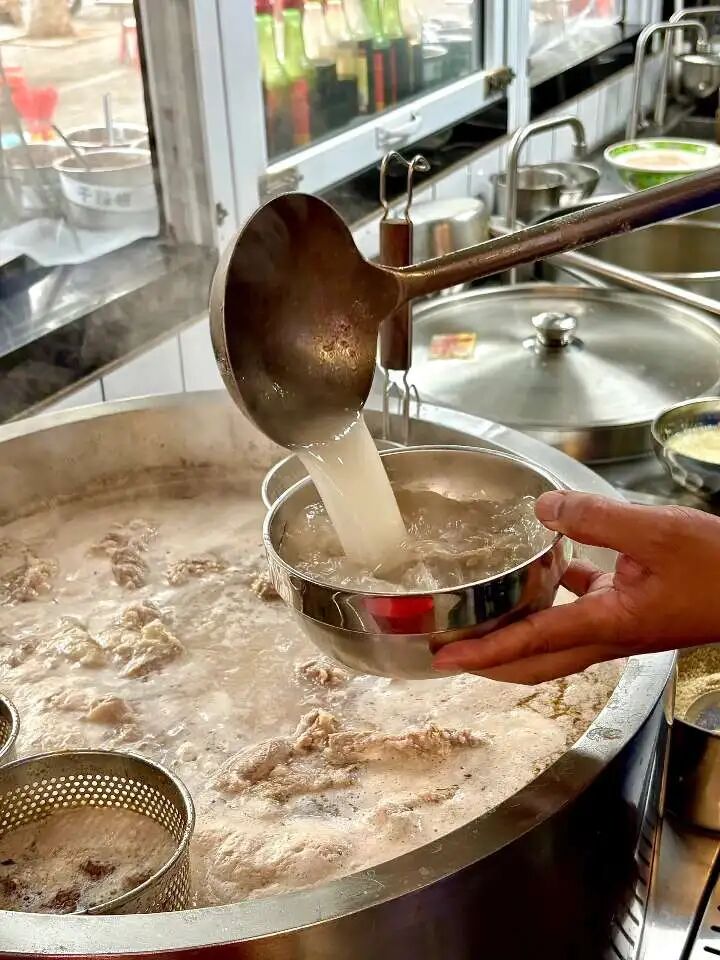 它在加入了十几种香料的大骨高汤中久煮不烂,吸饱了汤汁的精华,变得Q弹爽滑,富有嚼劲。配上烫熟的青菜、弹嫩的白豆腐和滑嫩的猪血,内容丰富扎实,一碗下肚,能量满满。