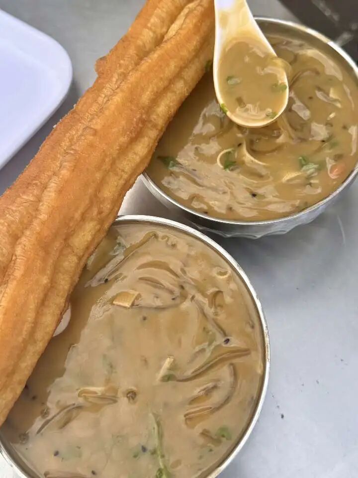 喝豆沫要趁热,勺子舀下去能尝到坚果的香脆,微微的甜味在舌尖散开,搭配一块咸香的油饼,简单却无比满足。