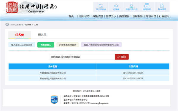 6月22日,在河南省人民政府新闻办举行的新闻发布会上,省委宣传部、省文明办、省发改委等17家单位,联合向社会公布了2018年上半年河南省诚信建设“红黑榜”,38家诚信企业“红榜”有名,15家企业因失信被列入“黑名单”。开封清明上河园股份有限公司被国家税务总局河南省税务局列入纳税守信企业,荣登“红榜”。