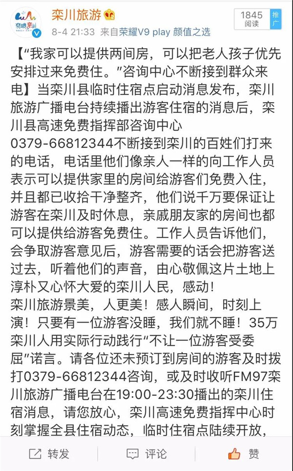 栾川县群众自发腾出自家房间,打电话到指挥部留下地址、联系方式,并嘱咐工作人员可以优先让老人和小孩免费入住;