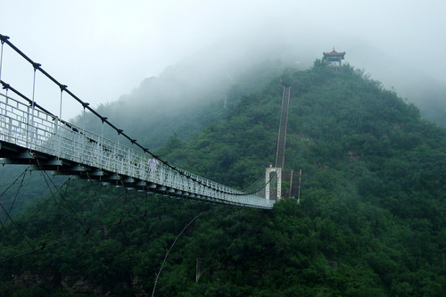 络丝潭景点位于浊漳河天桥断处,这里有独特的峡谷风光,更有神奇的美丽传说。漳河水从峡谷断崖上飞泻成瀑,如白马玉龙,咆哮翻卷,坠入水深百米的络丝潭中。夏季多雨时节,河水暴涨,跌落峡谷,生若雷鸣,其势状若壶口瀑布,蔚为壮观。峡谷之上架一索桥,连通冀豫两省,名曰天桥。人行桥上,宛如九霄步云。侧观飞流狂涛,俯瞰深涧幽潭,彩虹飞挂,情趣无限。峡谷南侧,激流掏出天然石洞,深达百米,鬼斧神工,沿螺旋梯拾阶而下,可直达神龟洞。