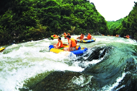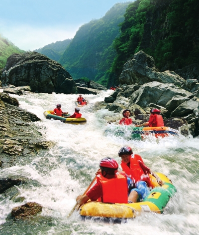 宝天曼峡谷漂流景区位于中国优秀旅游城市河南省南阳市的内乡县。宝天曼是河南省唯一的世界生物圈保护区、是南阳伏牛山世界地质公园核心景区、国家自然保护区、国家AAAA级景区,宝天曼峡谷漂流是生态型峡谷漂流,也是真正的峡谷第一漂,宝天曼峡谷漂流,全长12.8公里,分激流勇士和休闲娱乐双程漂。“波涛汹涌”的“浪花”给了别样的清爽感觉,239米的整体落差、九曲十八弯的漂流河道,冲浪区、激流区、水仗区、逍遥区,区区给我欢乐;神龟石、巨石滩、杜鹃山、蝴蝶谷、情人峡、神龙湾、月牙石、汉王台、湍河叠翠,处处令大家惊叹惊险刺激,挑战极限。河道刺激,惊险浪漫:在这段精华河道,分布两大漂段4大游乐区和9大景观。激流勇士漂长8公里,漂时3小时10分。
